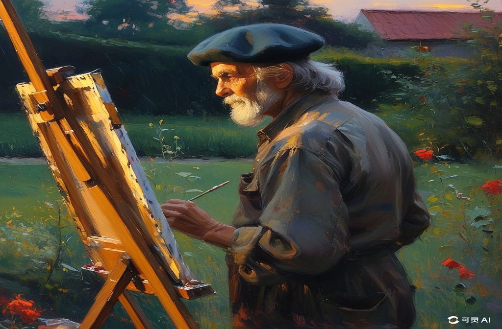 | An old painter wearing a beret stands in front of an easel and paints intently in the garden at dusk, with an impressionist style, soft lighting, close-up. | ![]() |
