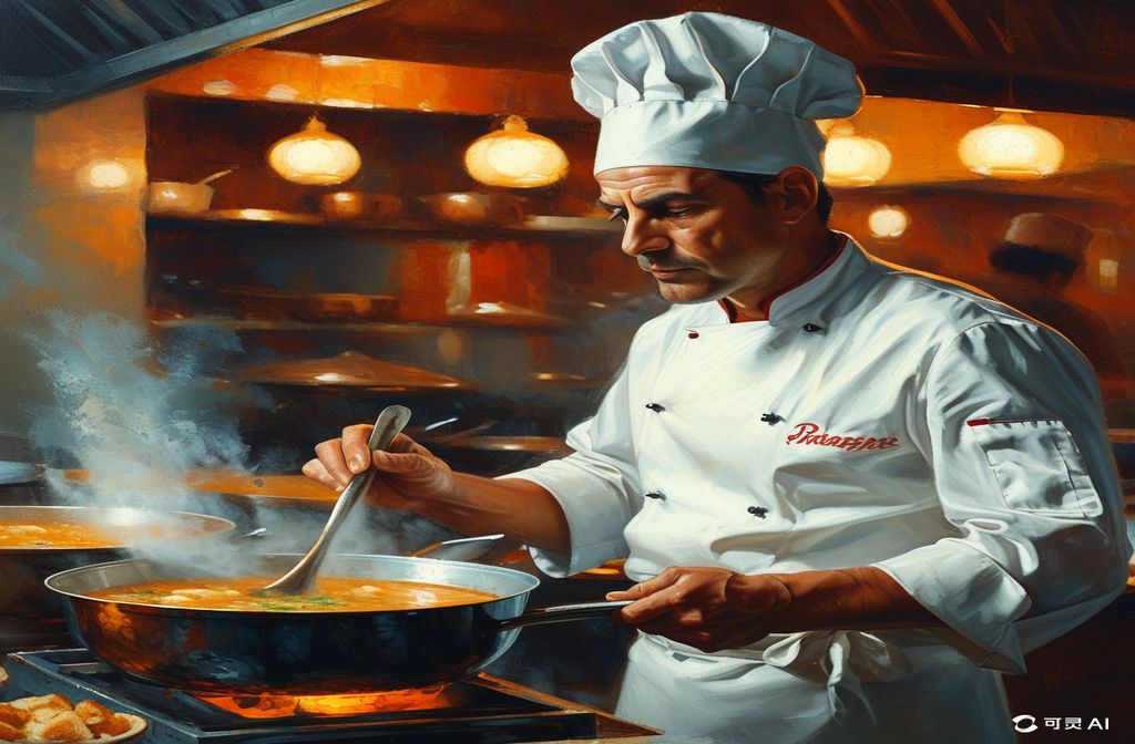 | A French chef dressed in traditional chef's attire holds a large pot and focuses on stirring the soup in the aromatic kitchen of a Parisian restaurant. This scene is depicted in the style of a 20th-century political poster, with oil painting techniques, warm lighting, and a close-up view. | ![]() |