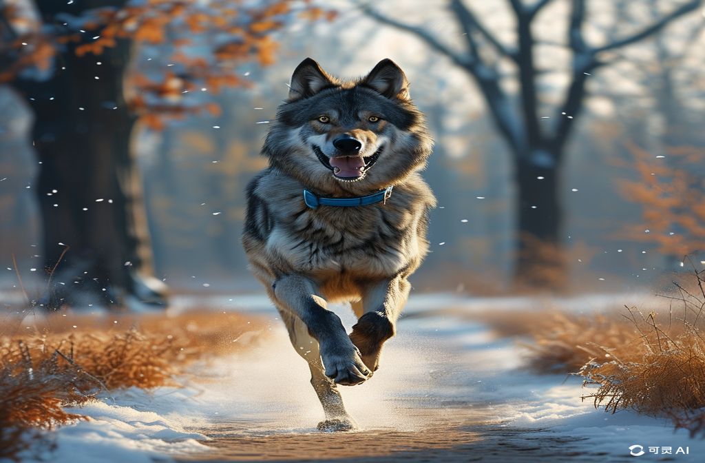 | A large grey- haired wolf dog wearing a blue collar happily runs on the park path in the winter morning, with a realistic style, exquisite texture, and long shot. | ![]() |