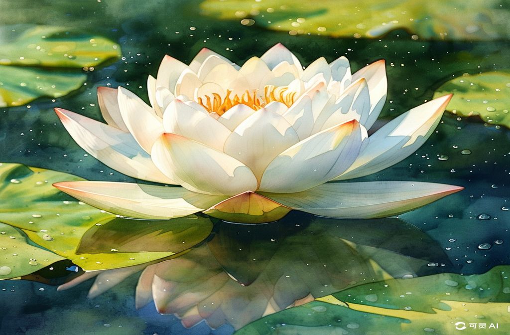 | A pure white lotus blossom quietly blooming on the water's surface in a summer noon pond, floating among green leaves, in a watercolor style with soft colors, in a close-up view. | ![]() |