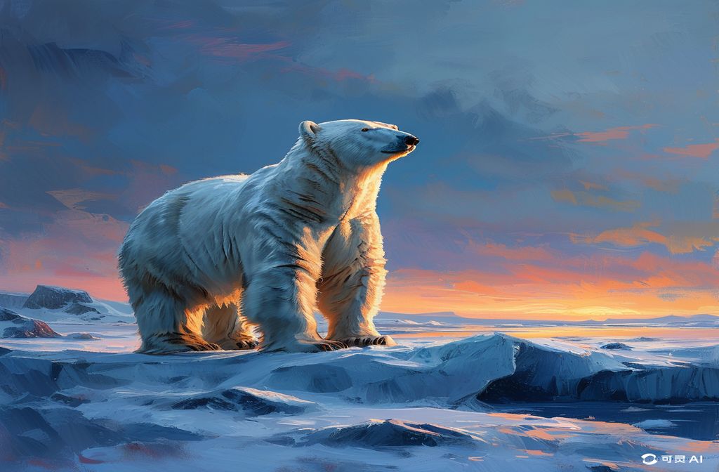 | A furry polar bear standing on the icy tundra at winter dusk gazing into the distance, in an lmpressionist style with soft tones, in a medium shot. | ![]() |